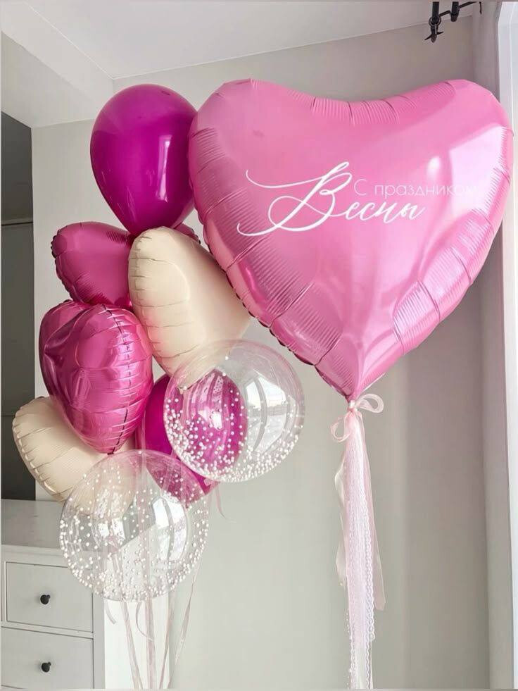 В набор "Весенний вальс" входит: Большое сердце с надписью, связка из 8 шаров (2 баблс с наполнением, 4 сердца, 2 пастель).